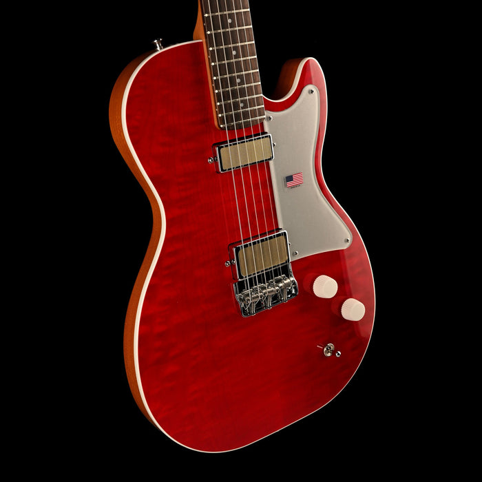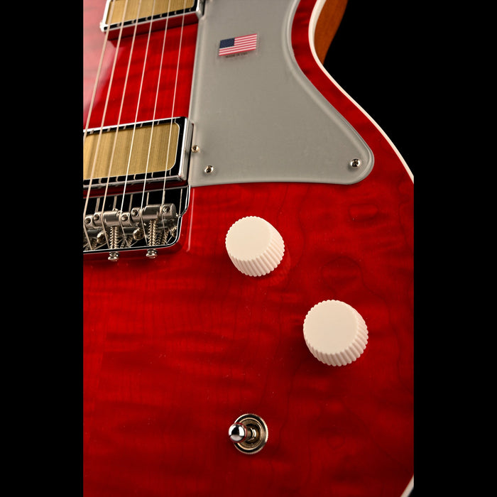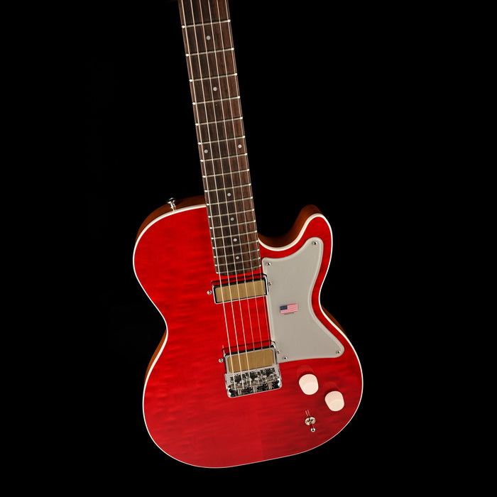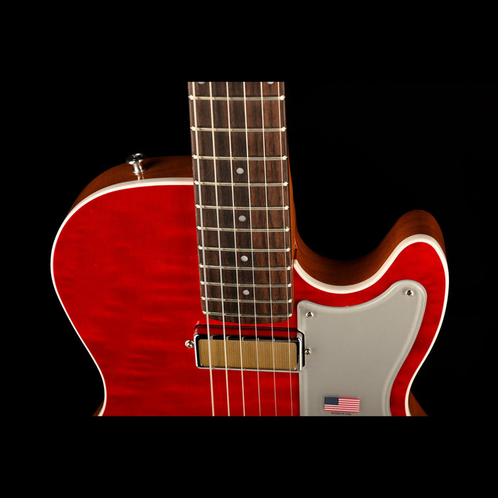 The Jupiter Thinline electric guitar blends the classic Jupiter shape with a chambered mahogany body, a maple top and a smooth mahogany neck. Here we have a super cool limited edition featuring a beautiful quilt maple top, finished in Transparent Red. It really shows the grain nicely, with each one quite unique. Only a small number of these were made, and we got one of the run, which is right here!