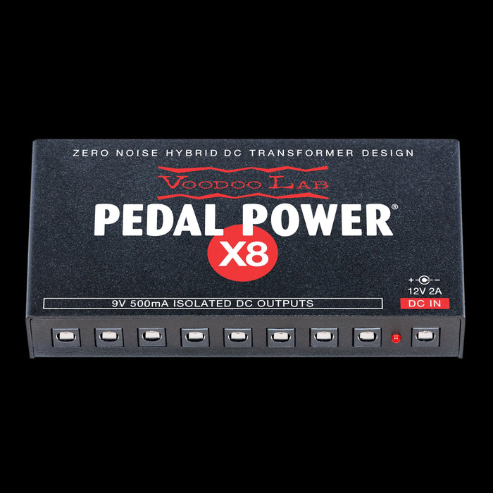 Equipped with eight galvanically isolated 9V DC outputs, Pedal Power X8 eliminates ground hum and unwanted interaction between pedals. Power 18V pedals by combining outputs with an optional voltage doubler cable or adapter.