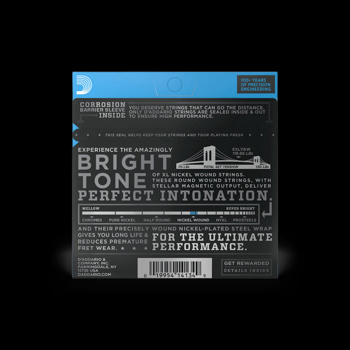 EXL115W is our popular medium gauging with a wound 3rd string. XL Nickel Wound electric guitar strings, long recognized as the industry standard, are ideal for a wide range of musical styles.