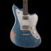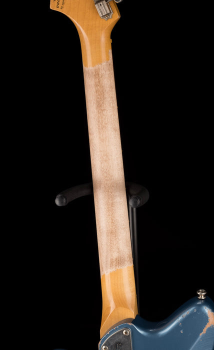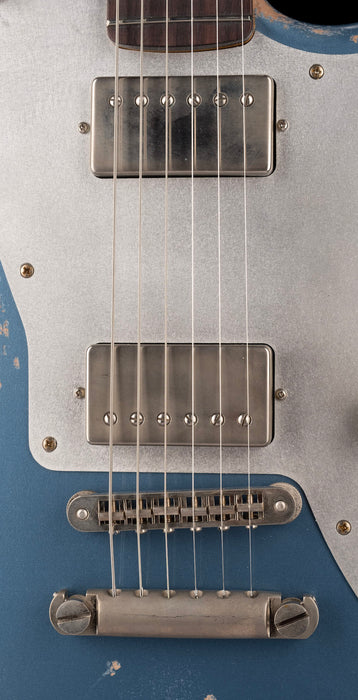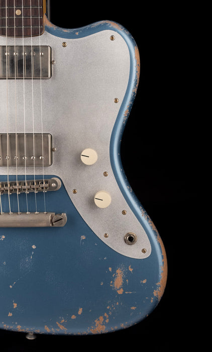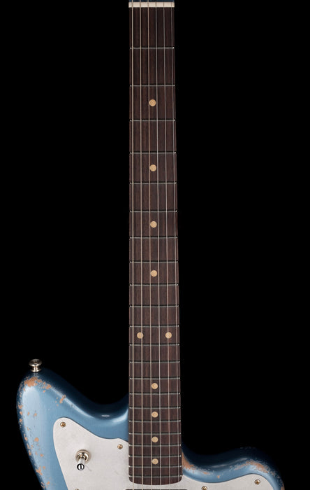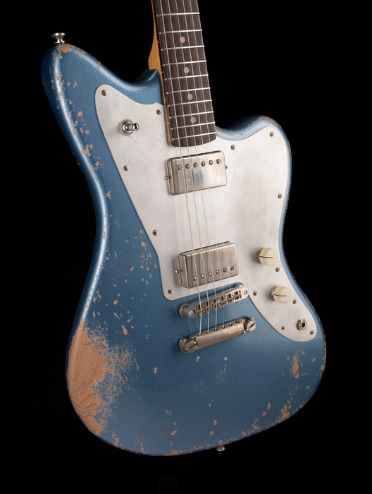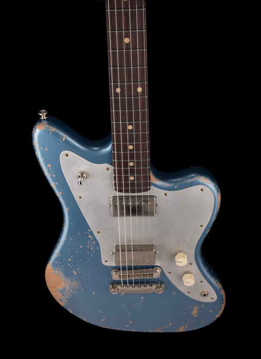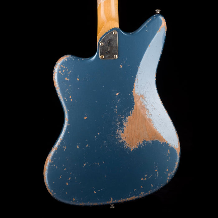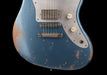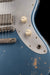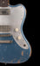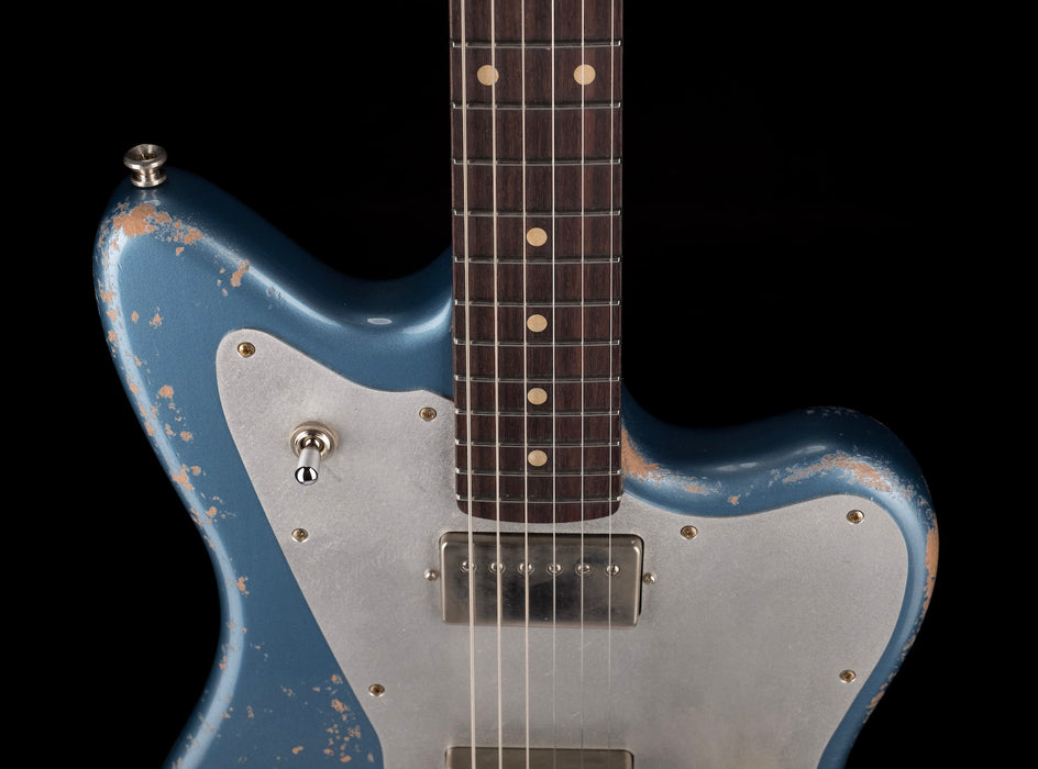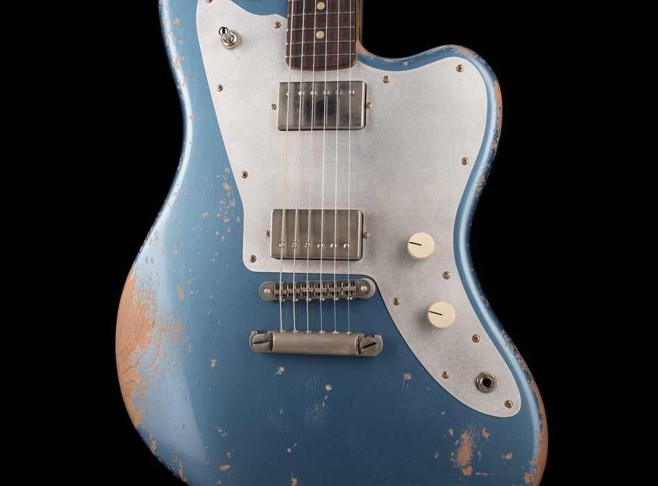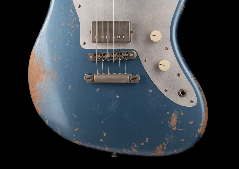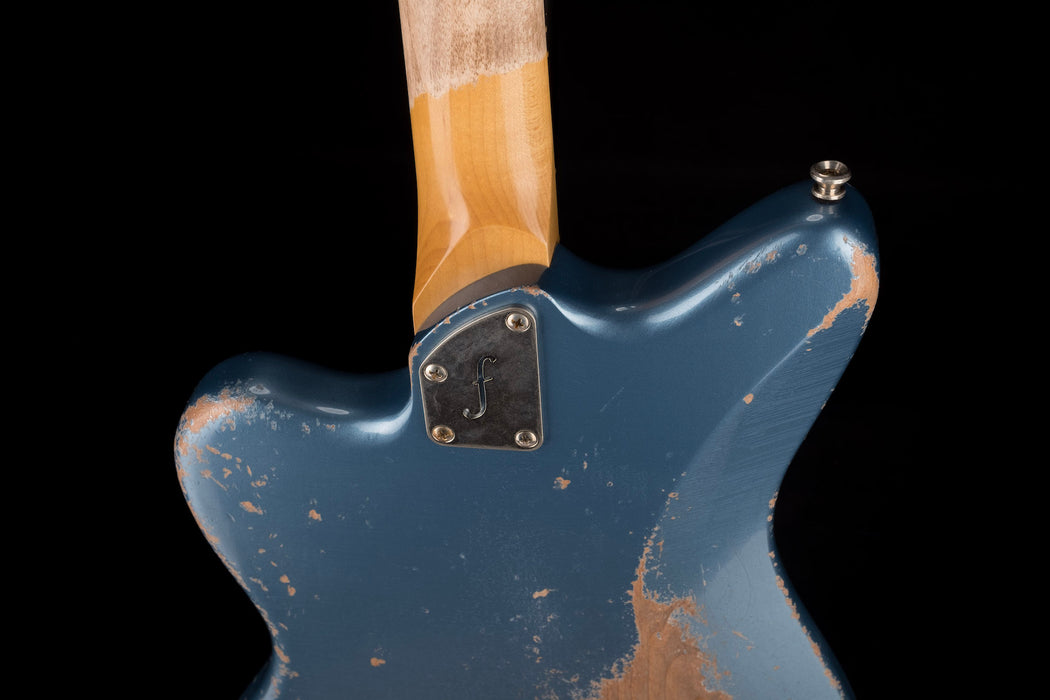 We started with the most popular platform - the JM6. This offset body style has proven to be Fano's most sought after. For aesthetics, we went with a super cool color that is rarely seen - Pelham Blue - and chose a Light Distress level, which was tastefully done. It's not just about looks through - it's also about feel. As soon as this guitar is in hand, one can tell why the Light Distress package is preferred by many. The parchment pickguard is a great match, as are the cream radio knobs.