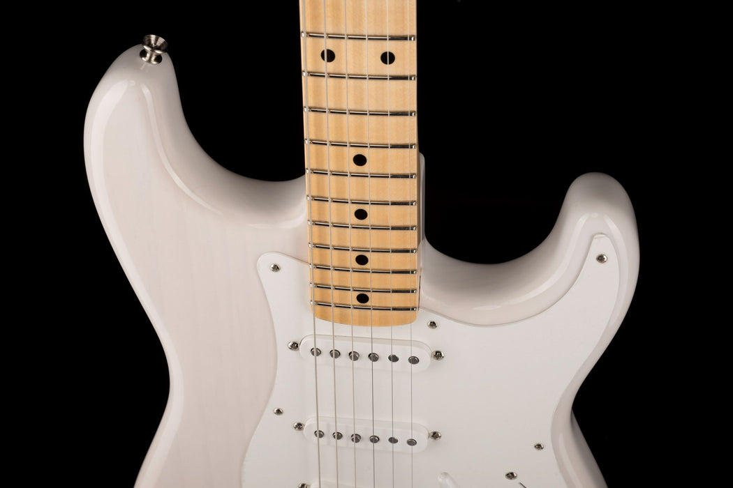 The main thing that stands out is the gorgeous White Blonde transparent finish. Typically done on an ash body, we chose to do this one with an alder body. The wood grain shows through just enough, and matches perfectly with the lightly tinted quartersawn maple neck. It features a super comfortable 10/56 "V" shape that is easy to play, especially for chords and smooth lead lines. This retains the guitar's vintage vibe - it's not a shredder-style super slim and thin neck. But if that's what you were looking for, you probably wouldn't be looking at this guitar! We did add the more modern tweaks of a 9.5" radius and 6105 frets - the two most popular customizations of vintage-style guitars.