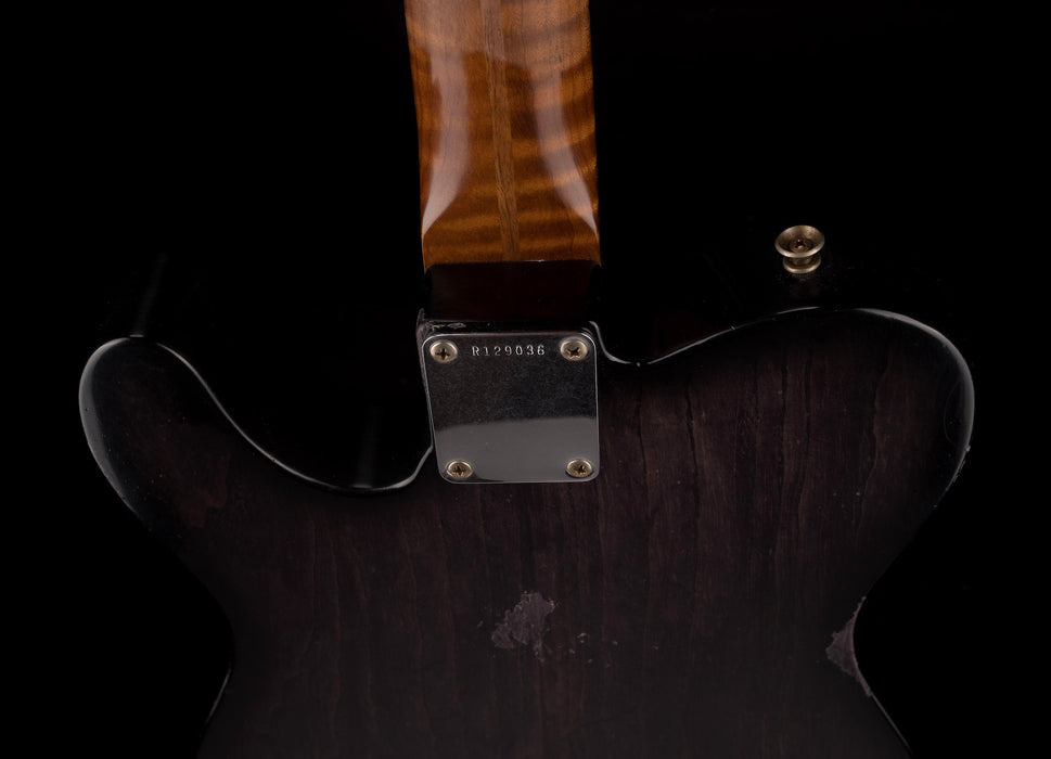 One of the first things you'll notice, of course, is the color: Ebony Transparent. This is a rarely seen color, but it's one we love here at Truetone. It's a transparent finish, so the wood grain of the ash really shows. We chose to do this one as a Relic, and David nailed it. The guitar has the look and feel of a guitar that has been around for decades as a serious player's main axe, and the finish shows it. It's all tastefully done. This is the first Relic that we've gotten from the hands of David Brown, and immediately were impressed. It's obvious he put his own care and taste into the guitar, which is exactly what we wanted. We really didn't know what the outcome would be when originally spec'ing it out, but couldn't be happier with the result. It's perfect.