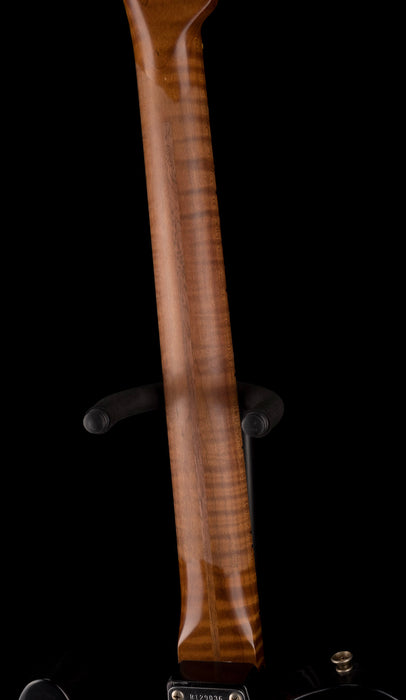 The neck is the next thing you'll notice - we sure did! It's an amazing piece of AAA Flame Maple, roasted. It has all of the feel & comfort you would expect from a masterbuilt instrument. David really does amazing work with the fine details on a neck, from the perfectly seated frets, rolled edges and overall playability. We didn't aim for a period correct V shape on this one - instead, we went for a Large C, which has become quite popular over. The C shape is really comfortable, and the girth of it will appeal to anyone that's a fan of 50's Teles. It has a 9.5" radius and Medium Jumbo (6150) frets, making it easy to play, even up high on the neck when bending notes.