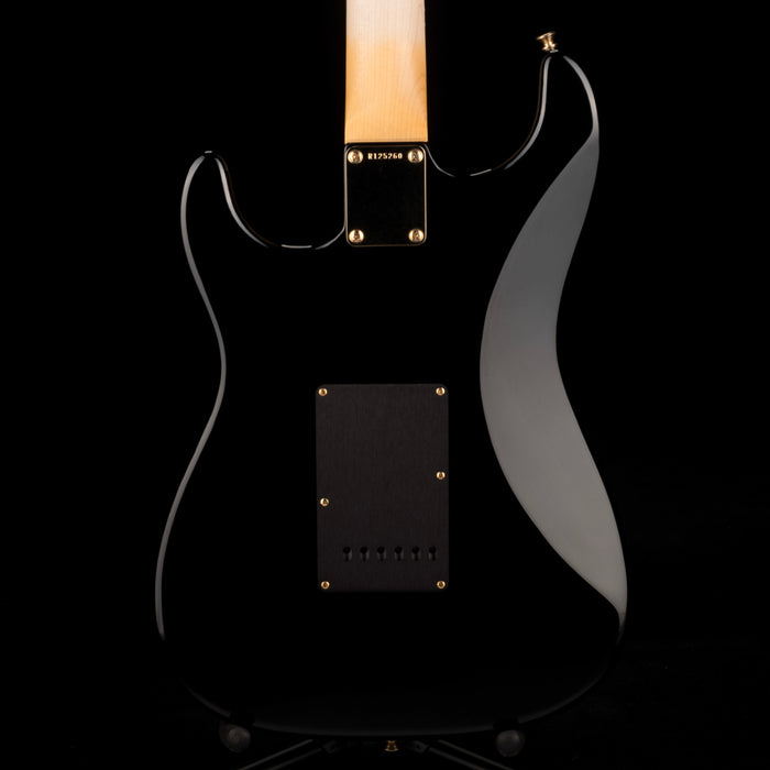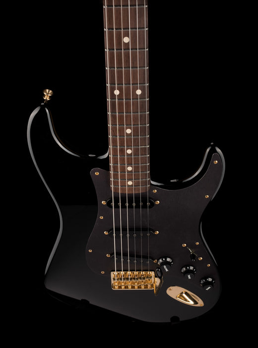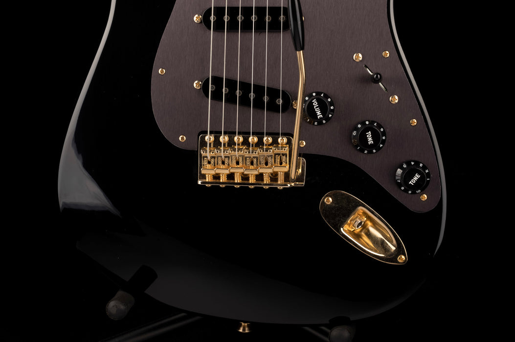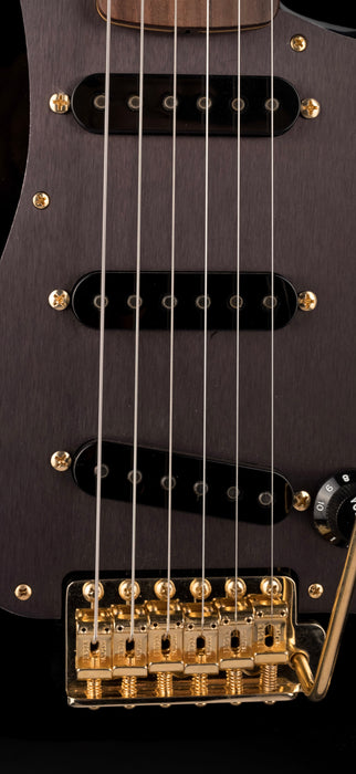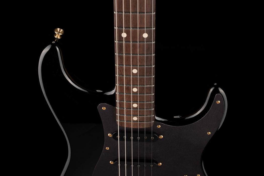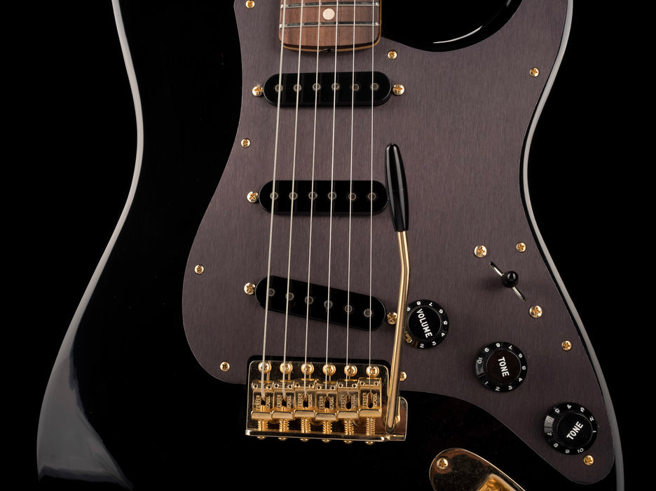 For the finish, we went for simple, refined, and high-class: this is a Deluxe Closet Classic in Black with a Matching Headstock, with a Black Anodized pickguard, gold hardware and black pickup covers and knobs. You probably haven't seen one like this before, and there really hasn't been one exactly like this. The Deluxe Closet Classic finish package is described like this: imagine a vintage guitar that was well taken care and religiously polished through the years, by an owner that took pride in keeping it clean. Moderate finish checking and slight oxidation of the hardware would occur naturally. Over time, the finish started aging, and like a fine wine, evolved into something complex and refined, with a distinct look and feel. An over the top description, yes - but accurate for a guitar like this!