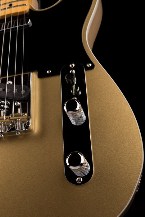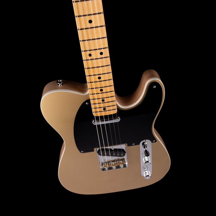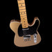 The two-piece ash body wears an NOS (New Old Stock) lacquer finish, without any of the relic work or aging that you normally see. While we love those guitars, we wanted this one to look like it just came out of the Fender factory yesterday. The color we chose, Aztec Gold, is definitely not what you would see on a Tele back in 1952, but that's the fun of this. You also wouldn't see one with binding on the top like this one has. What you would see is the single ply black pickguard, which we kept, as well as the ash body. For this one, we asked for the back & sides not to be painted, so that the beautiful wood grain shows. So, it's natural there, but Aztec Gold on top. Hence the "Truetone Two Tone Tele" moniker.