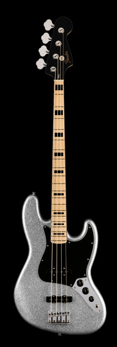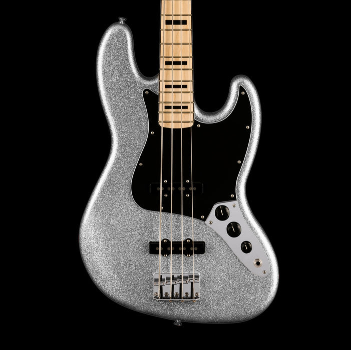 Featuring an alder body finished in dazzling silver sparkle and a sleek maple neck with black binding, block inlays and gloss black painted headstock, this bass is sure to turn heads. Boasting more than show-stopping looks, the Mikey Way Jazz Bass is built for maximum punch and versatility. A powerful pair of vintage-style ’70s single-coil Jazz Bass pickups deliver the classic sound that defined an epic era of rock. The ’70s “C”-shaped maple neck is comfortable and easy to maneuver for speedy riffs and high-octane gigs. Other features include a vintage-style 4-saddle bridge, ’70s style “Fender” stamped tuners, “Bullet” style truss rod nut and Mikey’s signature on the back of the headstock.