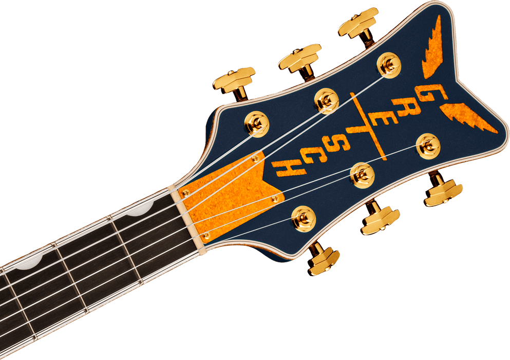 Boasting powerful sound and stage-ready tonal flexibility, this Falcon presents total sophistication — from the Midnight Sapphire or White gloss urethane finish to the gold Grover® Imperial™ locking tuning machines and gold jeweled G-arrow control knobs, to the gold sparkle bound neck, body and F-holes, to the striking pearloid Neo-Classic™ thumbnail inlays and gold vintage thick plexi pickguard with Gretsch and Falcon logos. A bold visual and sonic statement, the G6136TG Players Edition Falcon Hollow Body with String-Thru Bigsby and Gold Hardware updates the archetypical hollowbody electric guitar for modern players who demand distinction from themselves — and their tools.
