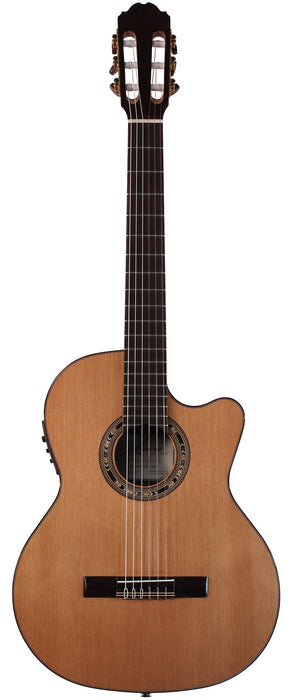 Solid cedar top; layered rosewood back and sides; 63 mm (2.5”) body thickness; mahogany neck with 500 mm fingerboard radius; rosewood fingerboard, bridge and headstock overlay; Venetian cutaway; gloss finish; wooden binding and rosette; bone nut and saddle; gold machines with rosewood buttons; Fishman Presys Blend system with built-in tuner; 650 mm scale length; 50 mm neck width at nut. Handcrafted in Europe. Deluxe fitted gig bag included.