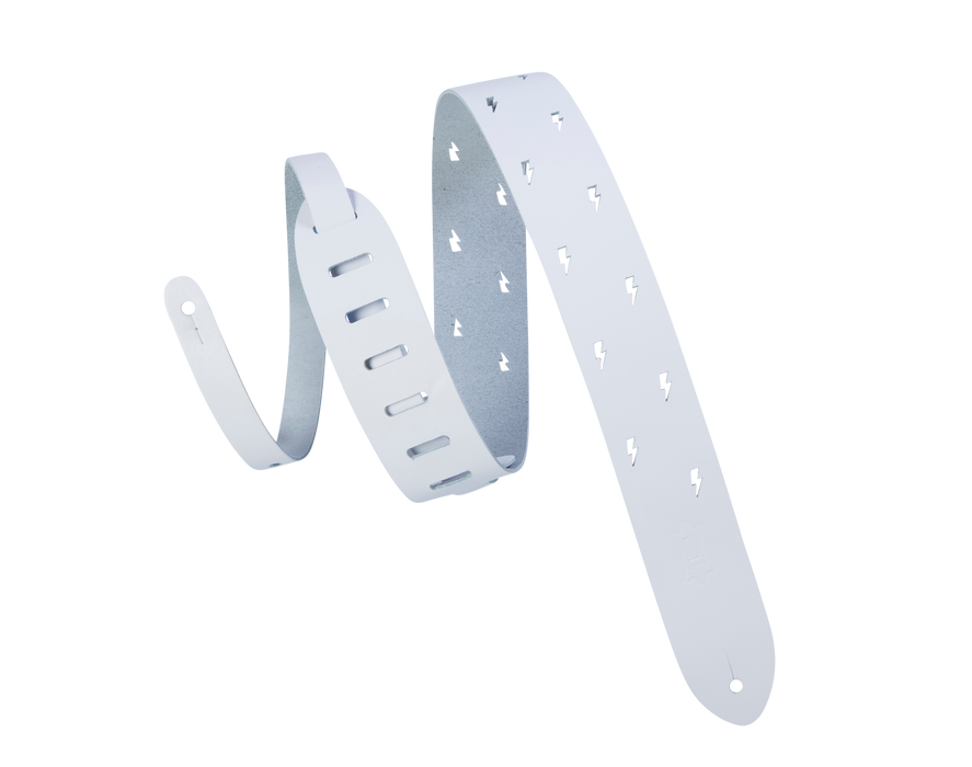 2" Chrome-tan Leather Guitar Strap With Lightning Bolt Punch Out Pattern. One-ply Strap Adjustable from 41 to 57". White Chrome-tan Leather Color And Natural Back.