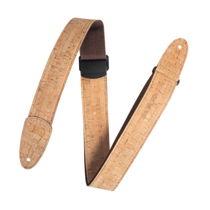 2 inch Cork Guitar Strap in Natural on Tan Cotton Webbing with Two-Ply Natural Cork Ends and Black Plastic Slide and Loop Adjustment. Adjustable from 35 to 60 inches.