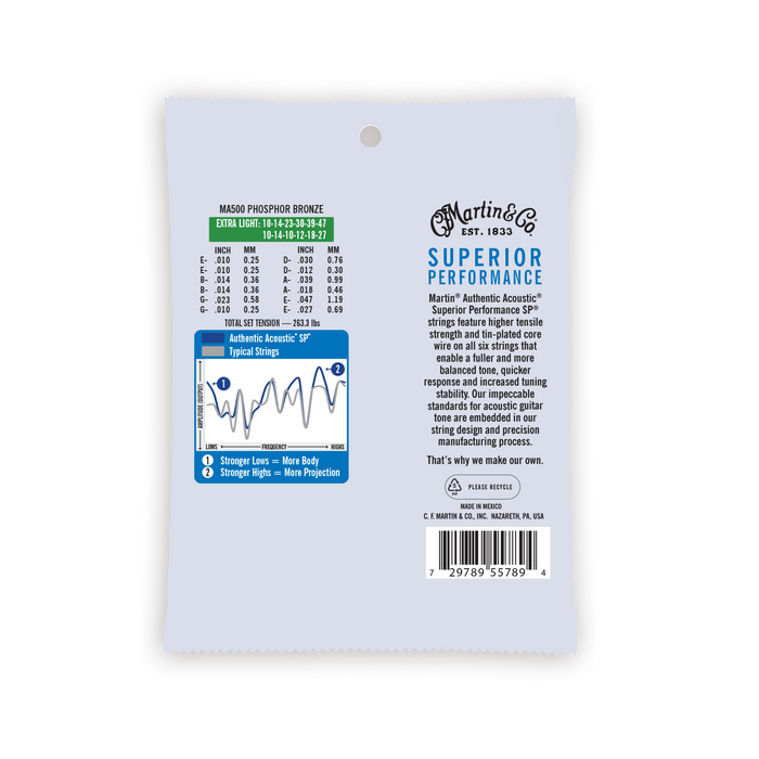 Martin® Authentic Acoustic® Superior Performance SP® strings feature higher tensile strength and tin-plated core wire on all six strings that enable a fuller and more balanced tone, quicker response and increased tuning stability. Their impeccable standards for acoustic guitar tone are embedded in our string design and precision manufacturing process.