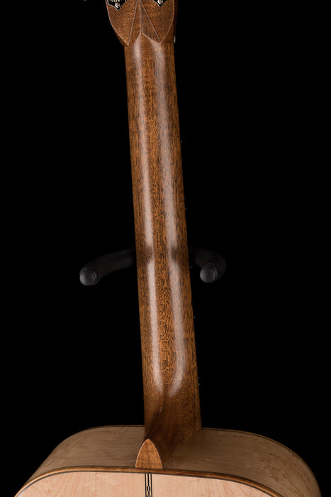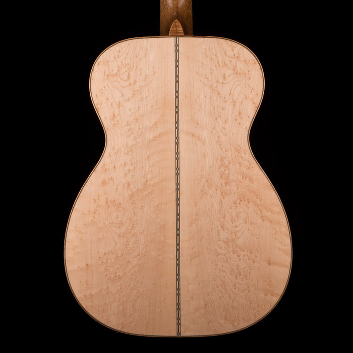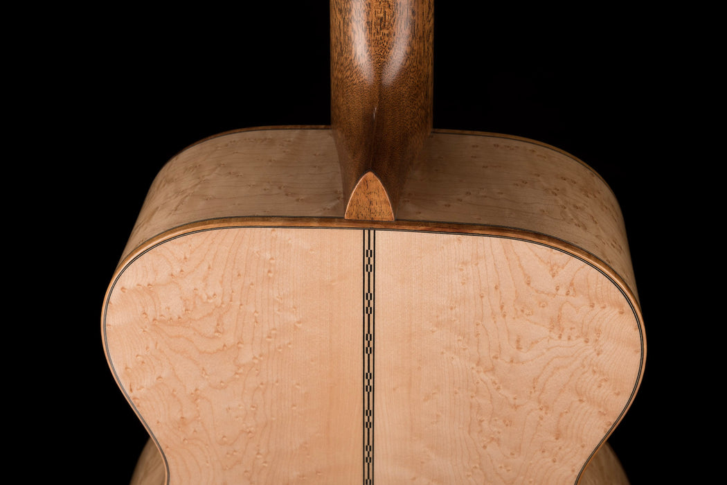 The stunning hand-selected Birdseye Maple is what draws your eyes at first, but as beautiful as it is, this wasn't done just for aesthetics. Maple is one of the most acoustically transparent tonewoods, due to a low velocity of sound and a high degree of internal damping. It's dense and bright, something that some players desire as a counter to other woods like mahogany. On this guitar, we also chose an Alpine Spruce top, which is a bit warmer, to offer a balance against the Birdseye Maple. It's a very focused tonewood, so this is perfect for fingerpicking.