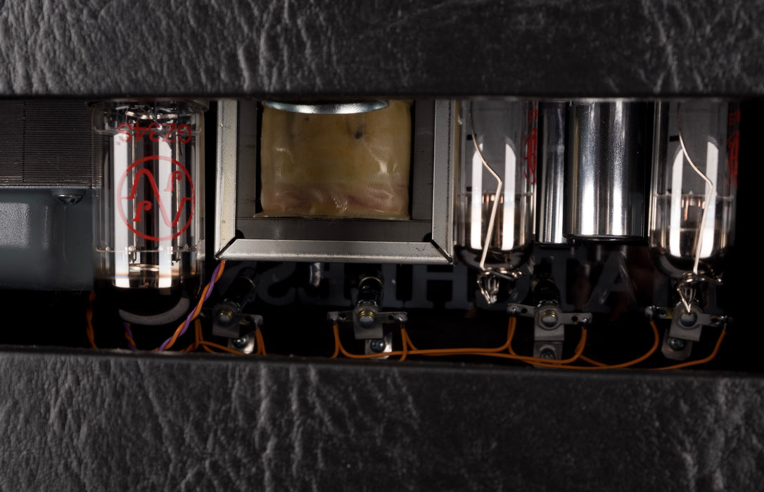 The preamp sections are based on a layout of two 12AX7’s in Channel 1 and one EF86 in Channel 2. The two 12AX7’s in Channel 1 create a parallel-triode circuit with interactive bass and treble. The one EF86 in Channel 2 consists of a high-gain pentode coupled to a six-position tone switch. Outright benefits include quick dial-in of new tones and an easy return to the settings you prefer. Also “high treble” cut control, master volume, with a bypass feature that offers flexible control of the power amp section. The power amp is fed by a 12AX7 phase inverter, which drives four EL84 power tubes. The rectifier circuit gives you the flexibility of using one 5AR4 for a quick attack or you can use two 5V4’s for a smooth, round response. Other professional features include an effects loop, half power-mode switch (a conservative 30 watts switching to 15 watts), output impedance selector (4, 8, 16 ohms) and a speaker phase-reverse switch.