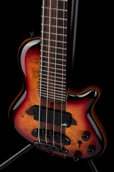 This bass has a amazing body, Swamp Ash with a Buckeye Burl maple top, Rosewood fretboard, 5-ply Wenge neck, Aguilar DCB pickup, Aguilar OBP-3 Pre-Amp, and a Natural Gloss finish.