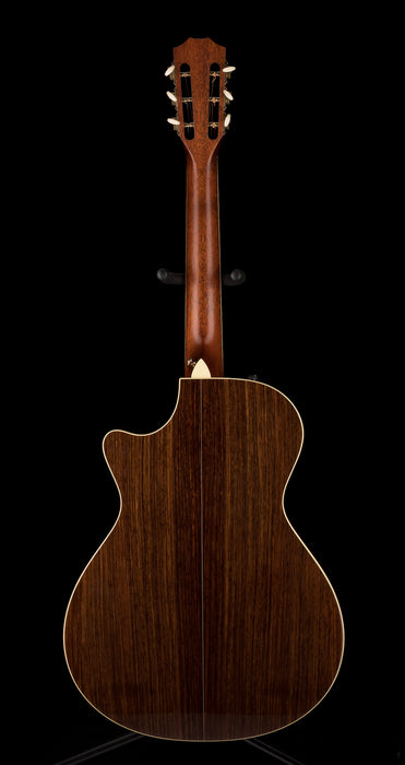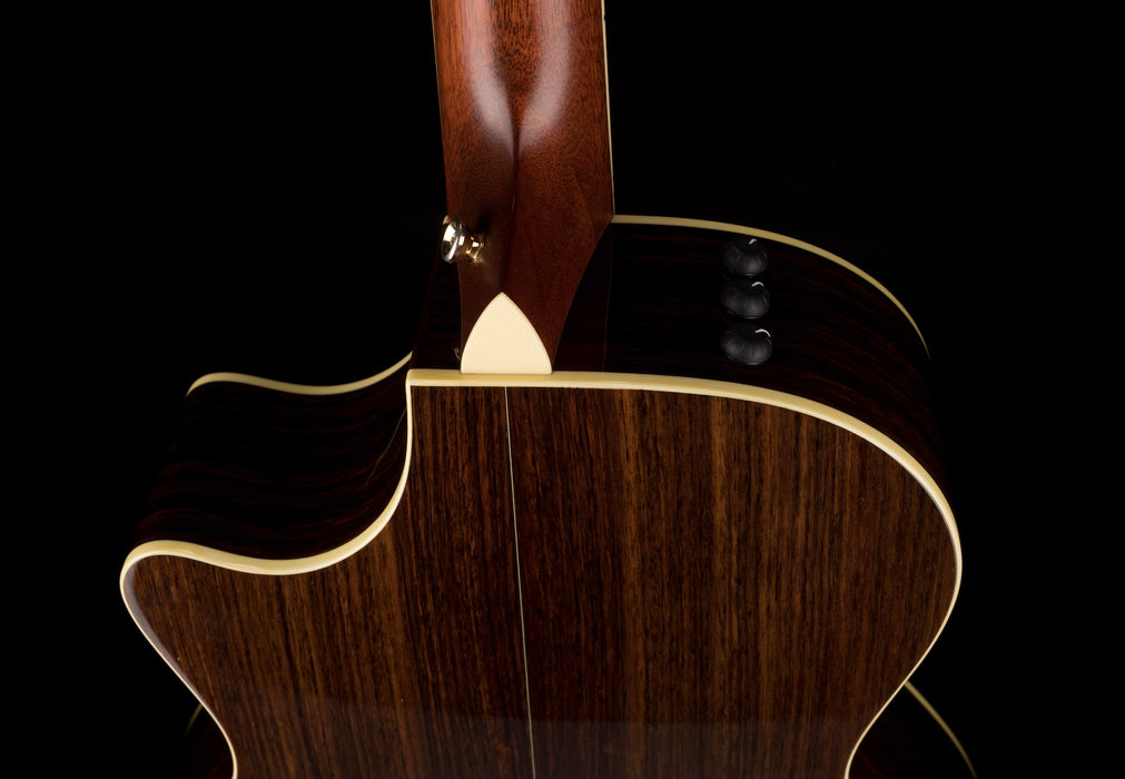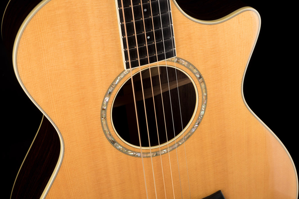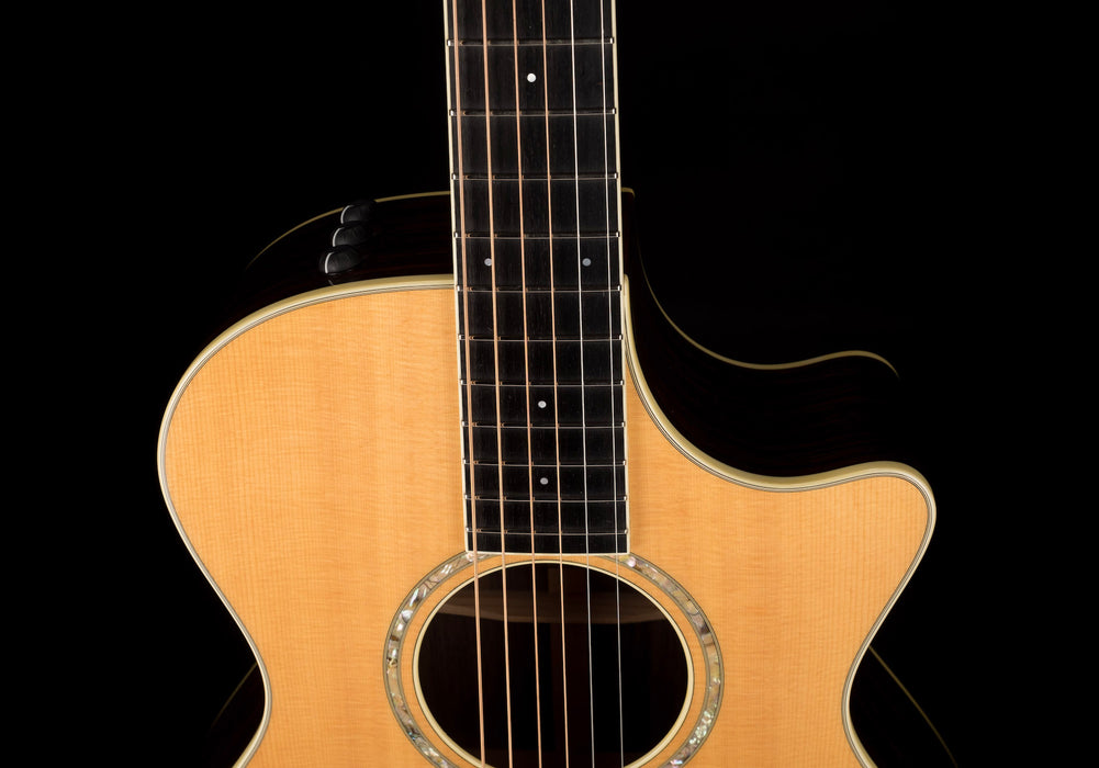 This Taylor 12-fret sounds amazing acoustically, but also is perfect for plugging in thanks to Taylor's Expression system. Featuring all solid woods, this guitar has a beautiful Sitka Spruce top along with Indian Rosewood back & sides. It's really resonant and we noticed right away how balanced the tone is. The Mahogany neck with an Ebony fretboard is smooth and easy to play. It's topped by a slotted headstock and Antique Gold tuners with Ivoroid buttons, something you don't see on a lot of Taylor guitars. The cutaway gives you easy access to the upper register, and this guitar is a joy to play.