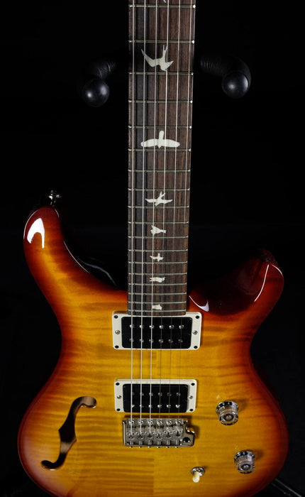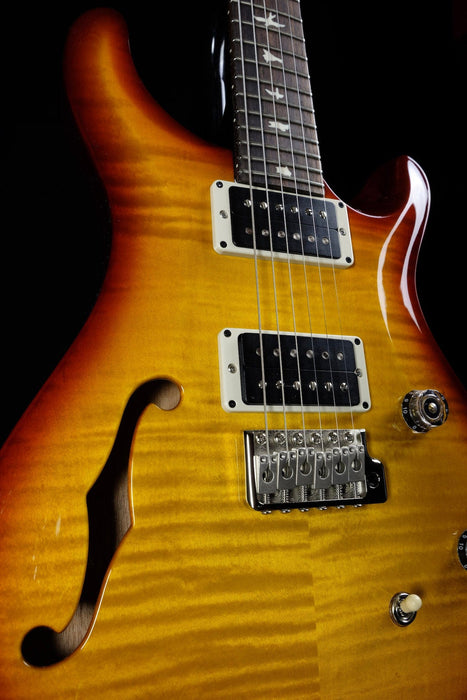 Combining the snap and sustain of a bolt-on guitar with the airy resonance of a semi-hollow body, the CE 24 Semi-Hollow is a truly unique addition to the PRS Bolt-On lineup. The body pairs the traditional combination of a mahogany back and maple top with a bolt-on maple neck and rosewood fretboard. The neck features a Pattern Thin carve and satin nitro finish for a natural, addictive feel. The electronics consist of a volume and push/pull tone control with a 3-way toggle switch, giving a total of six classic sounds from the PRS 85/15 pickups.
