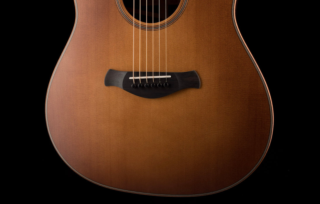 A Wild Honey Burst top and low-sheen finish heighten the old-soul aesthetic appeal of this Builder’s Edition Grand Pacific, which builds on a long tradition of rosewood/spruce dreadnoughts but breaks new ground with an entirely new Taylor sound.