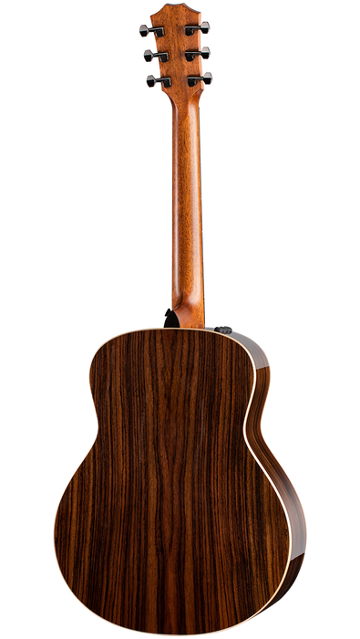 One of the first GT guitars to be released in the context of an existing series, the GT 811e blends the dazzling sparkle and warmth of Indian rosewood with the unmatched playability of the GT’s comfortably compact frame. With its shorter body and scale length, the GT’s proportions are smaller than the Grand Concert but larger than the GS Mini, finding a sweet spot where comfort meets rich, solid-wood tone. The superstar tonewood pairing of Indian rosewood back and sides with a Sitka spruce top delivers all the clarity and balance you’d expect from a full-size rosewood guitar, while its smaller footprint and shorter scale (24-⅛”) provide a slinkier feel that makes complex chords or arpeggio formations easier to hold. Under the hood, the GT 811e reflects Taylor’s envelope-pushing design approach—we’ve adapted the tone-enhancing benefits of V-Class bracing into a new pattern that provides similar increases in volume and sustain for the GT’s smaller frame. Called C-Class bracing, this interior architecture boosts the response in the bass range, yielding warmth and presence that a guitar of this size typically can’t produce. This model is appointed to match its counterparts in the 800 Series, featuring maple binding with black purfling accents, a single-ring abalone rosette, a thin 4.5-mil gloss finish on the entire body, and mother-of-pearl fretboard and peghead inlays in our Element pattern. The GT 811e ships with built-in ES2 electronics for organic plugged-in tone and comes with our exclusive AeroCase, whose ultra-lightweight construction and padded walls provides ample protection.