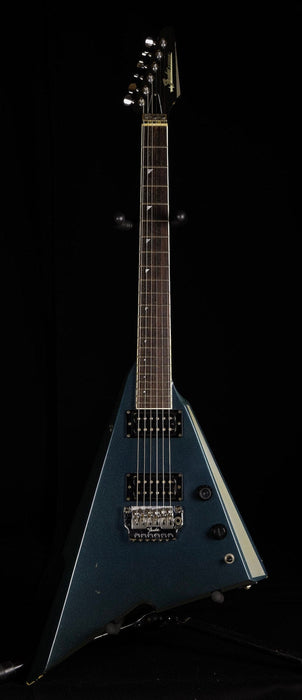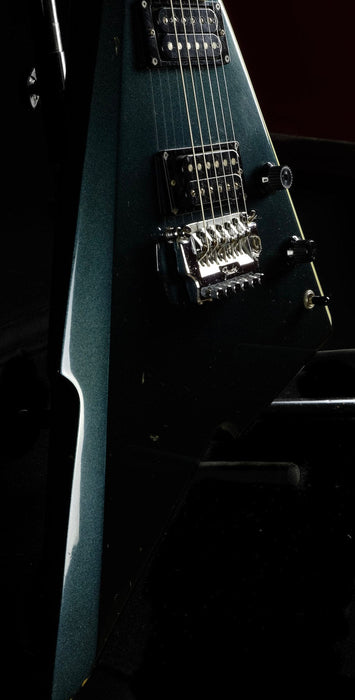 This particular Katana is in relatively good shape, though years of playing are evident.  It has a beautiful Green Metallic finish with gold accents.  It's truly a sight to behold.  It has a very fast and smooth playing neck, locking trem (sorry, no arm was included when it came in) and dual humbuckers.  Comes with the original hardshell case (custom fit for the body), which makes this an even more attractive find.