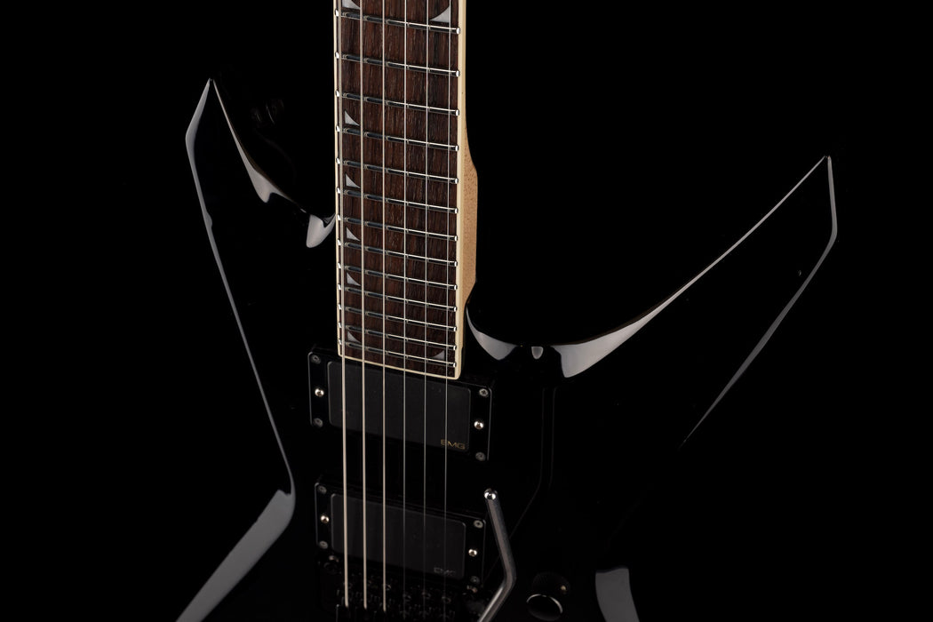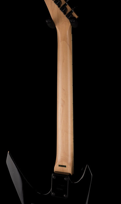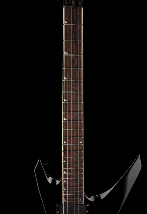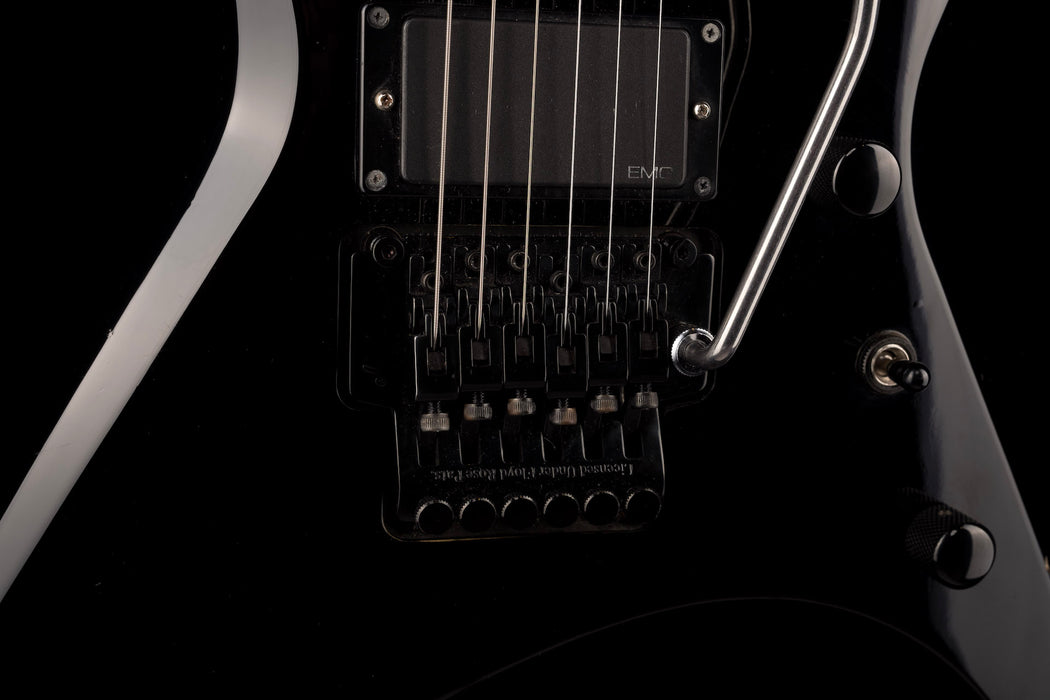 This Jackson Warrior features 24 frets, small shark fin inlays, a locking tremolo (licensed Floyd Rose), active electronics and power EMG pickups. It's all original, other than the trem arm.