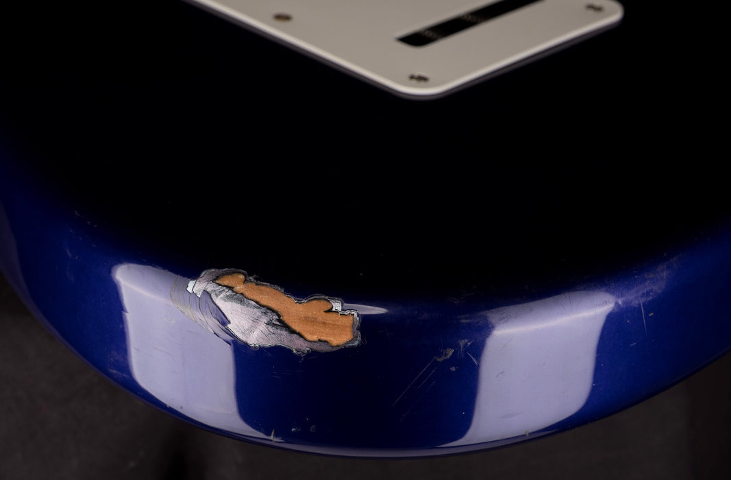 Up for sale is this Fender Standard Stratocaster in one of the more rare colors Metallic Blue. The Standard Stratocaster is one of the most imitated guitars of all time, for a very good reason. With 3 pickups and a maple neck this instrument is super flexible for any style of music. This instrument is good working condition, there are scratches, and one big ding on the bottom. Please check photos for wear.