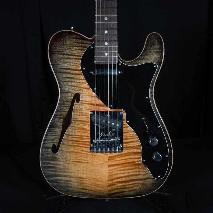 This one was designed by one of our customers and now is for sale. It is a great one of a kind instrument! Semi hollow body design with a traditional F-Hole, gorgeous finish that shows off the flame maple top beautifully. Ultra light weighing in only 6 pounds, this instrument plays and sounds fantastic!