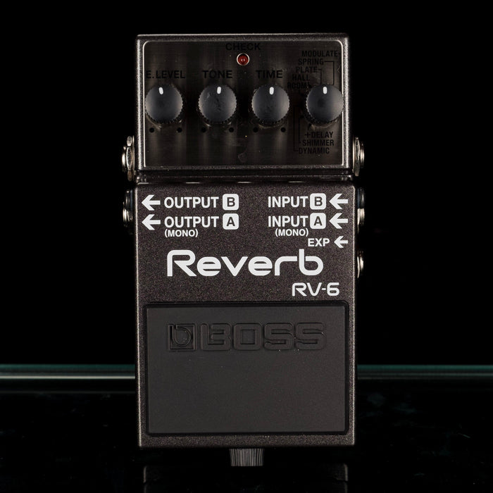 Here for you is a great compact reverb pedal, the Boss RV-6! This is the latest version of the single pedal RV series and has everything from the previous versions and more. You get the same classic reverb sounds such as Spring, Hall, Room, and Plate. In addition to that you get exciting new modes such as Shimmer, Dynamic, and fan-favorite Delay+Reverb. This pedal has it all and will keep in the depths of lush reverb, This pedal is in excellent condition and comes with a box.