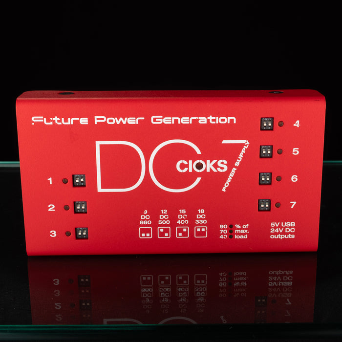 Here for you is the amazing Cioks DC7 Power Supply! The DC7 has a one-inch (25,4mm) profile and weighs 1.1 pound (500 grams) thanks to the pure 2-stage switch-mode technology inside. It features a low profile with a high power rating and puts out a maximum of 48W. This is very useful to connect multiple high-current effects such as devices from Strymon, Line 6 and Eventide. This power supply puts out very little noise and is in good condition.