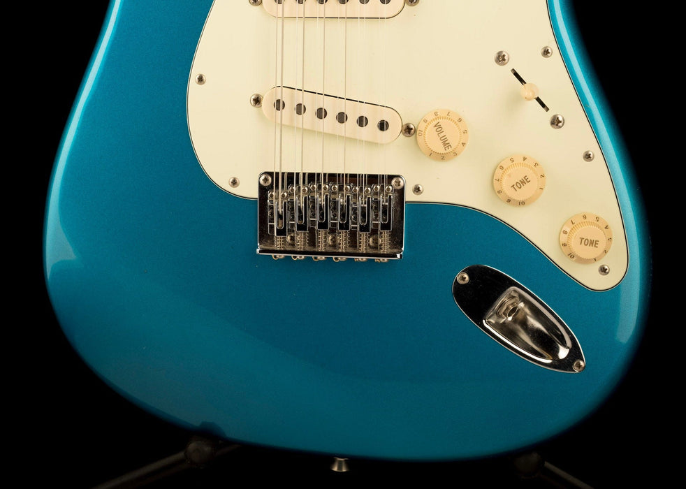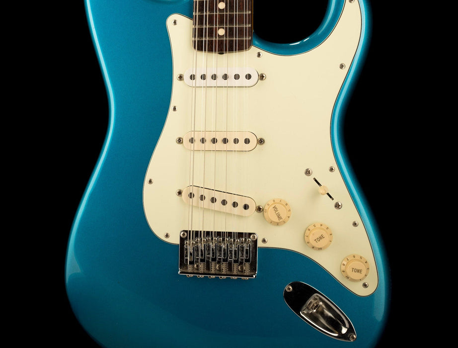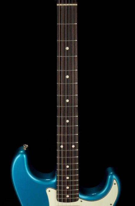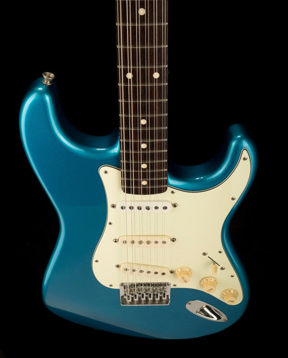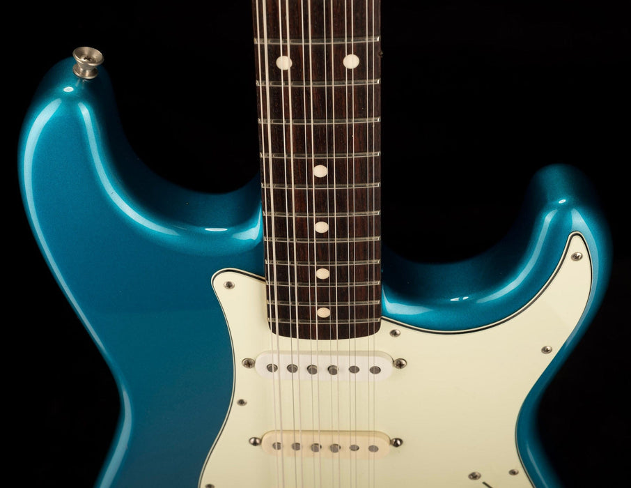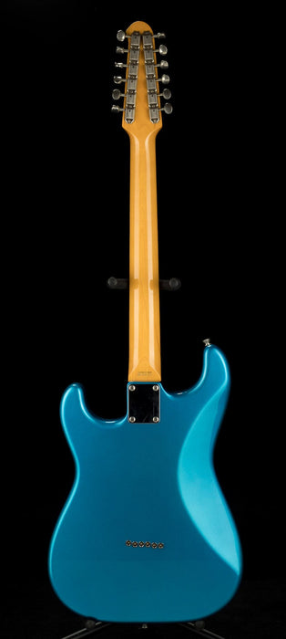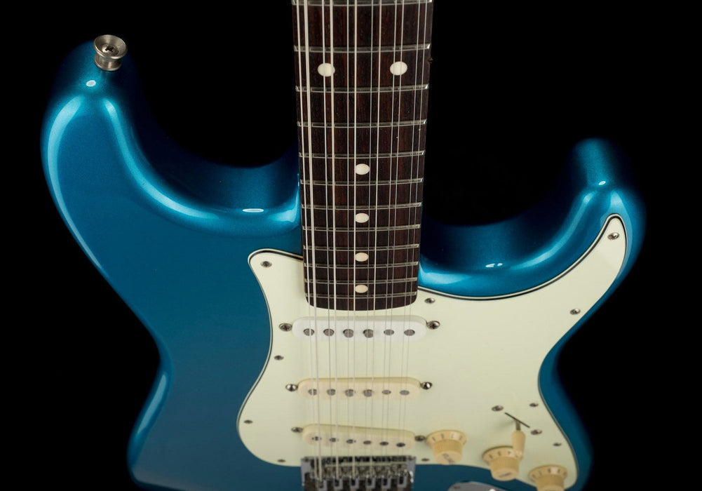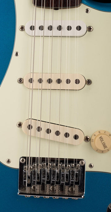 Here's a rare bird that just flew in: an early 2000's, Crafted in Japan, special edition Fender Strat XII. You don't see many of these around, especially from this era, and definitely not one that looks like this. It's a very cool Lake Placid Blue finish, which has faded and morphed into a slightly different color. It's almost a mix of Lake Placid Blue and Ocean Turquoise.