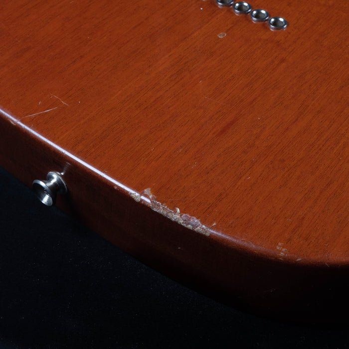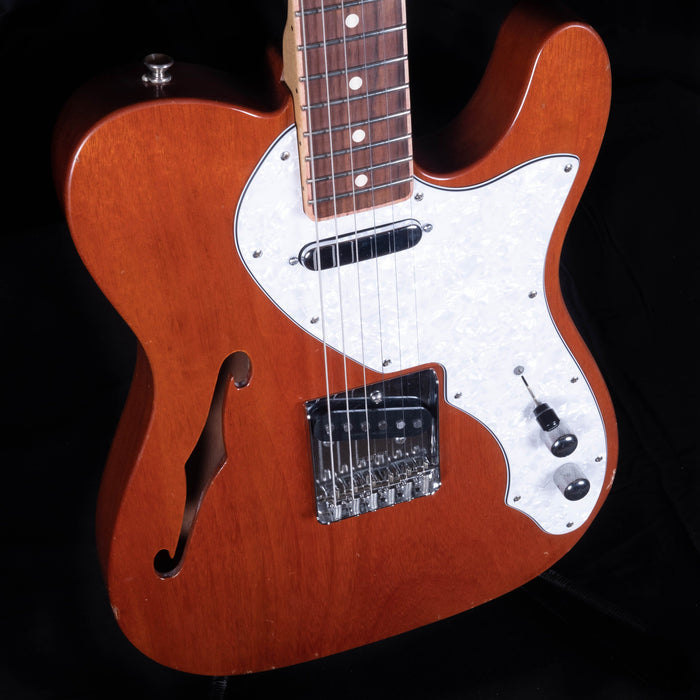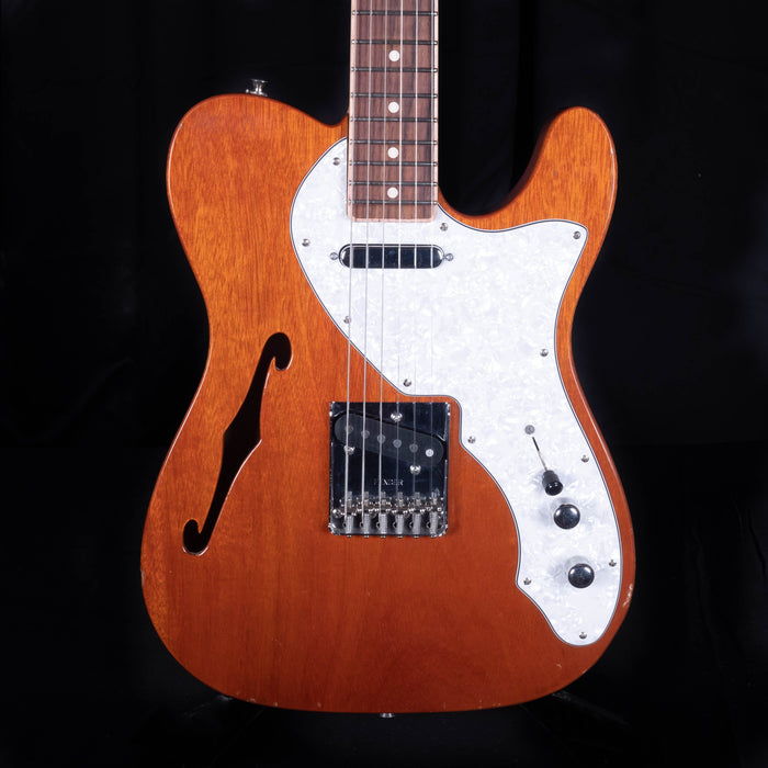 This Classic Series '69 Mahogany Thinline Fender body has a USA Channel Bound Fender Tele Neck (maple with inlaid rosewood fretboard). It is loaded with a Fender pickguard, Fender Classic Series 69 Tele pickups, Deluxe Locking Tuners, Fender Custom Shop neck plate.
