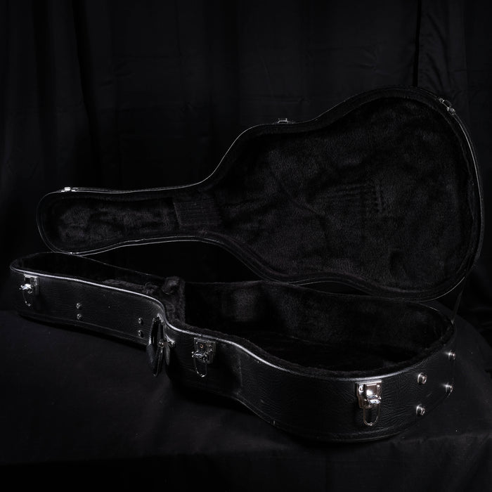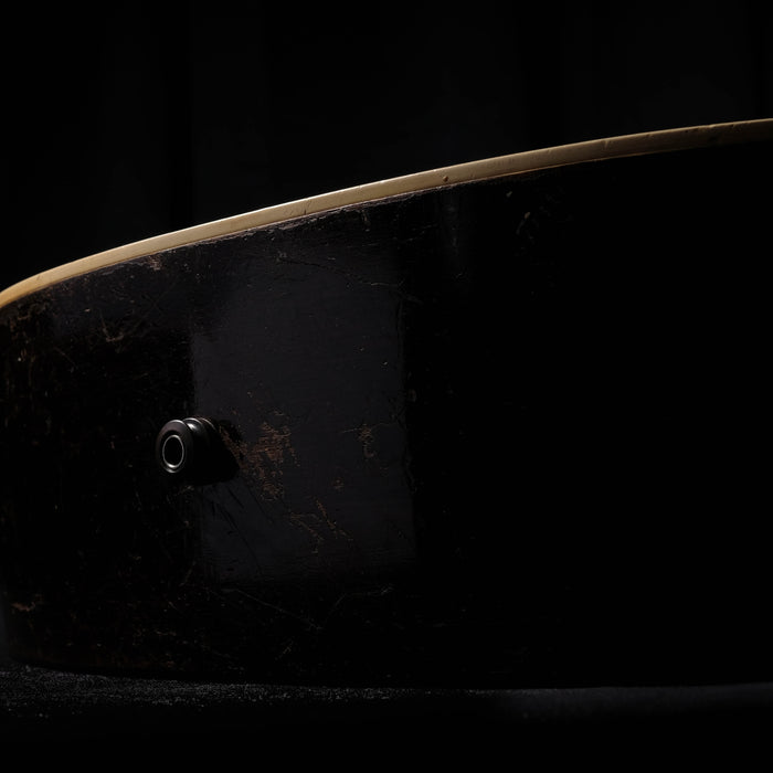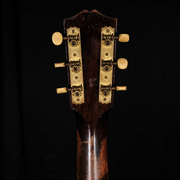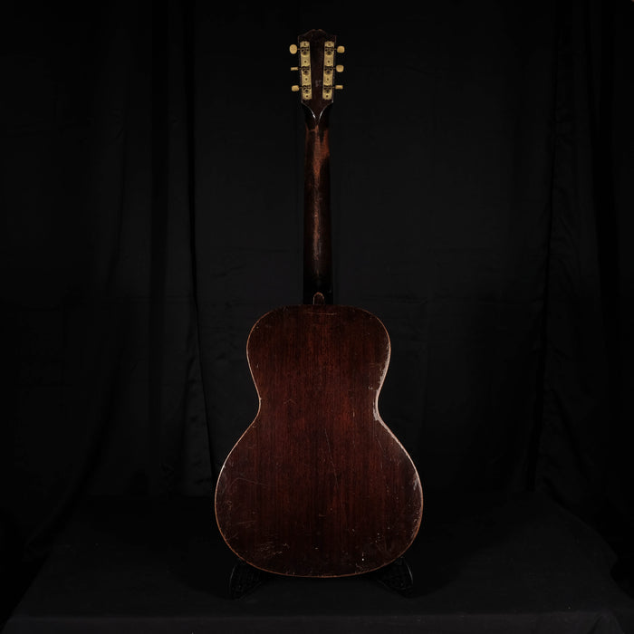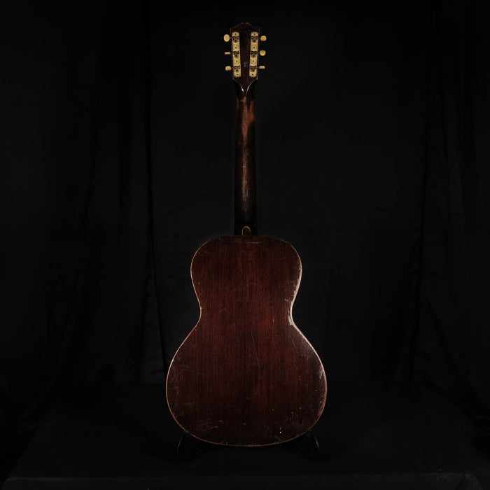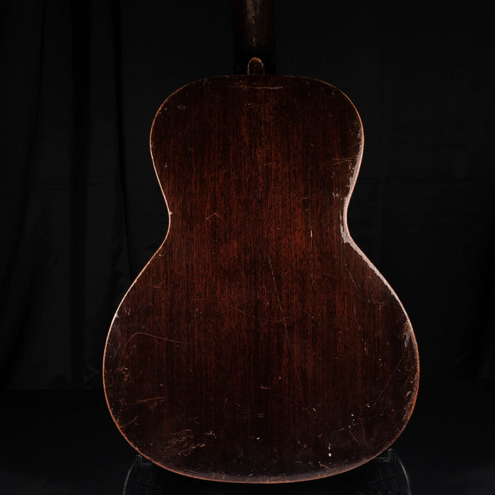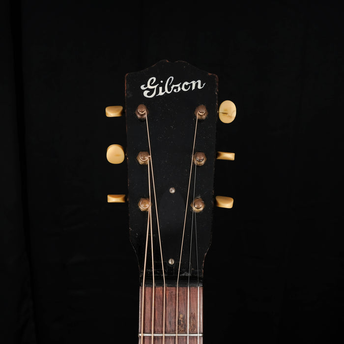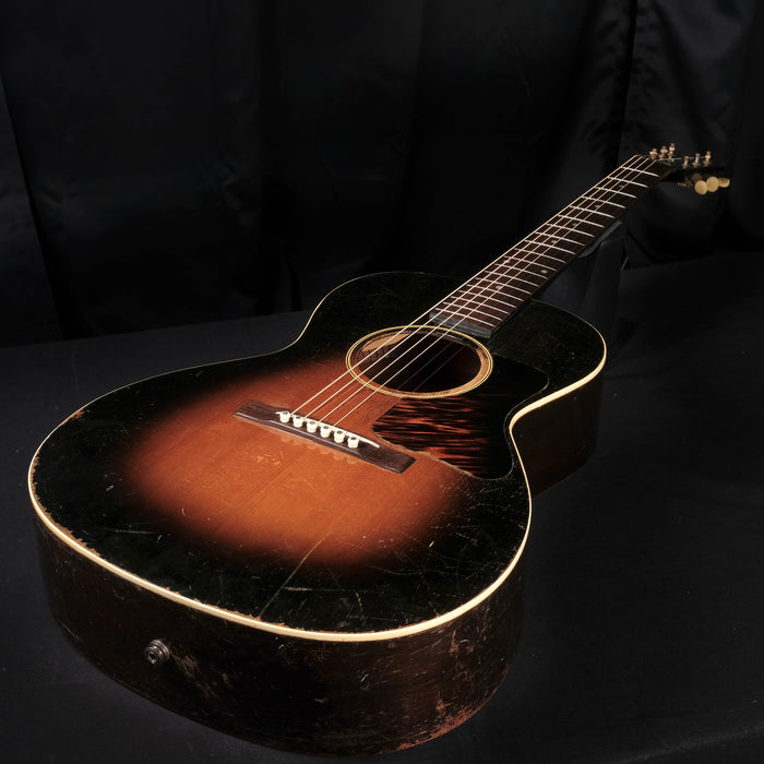 The L-00 was a flattop produced by Gibson starting in the early '30s. Some of the earliest examples featured a white pickguard and a black finish, though a sunburst finish and tortoiseshell pickguard became the norm by the mid-'30s (the black version was phased out by 1938). The earliest examples also had a 12-fret clear of the body fingerboard.